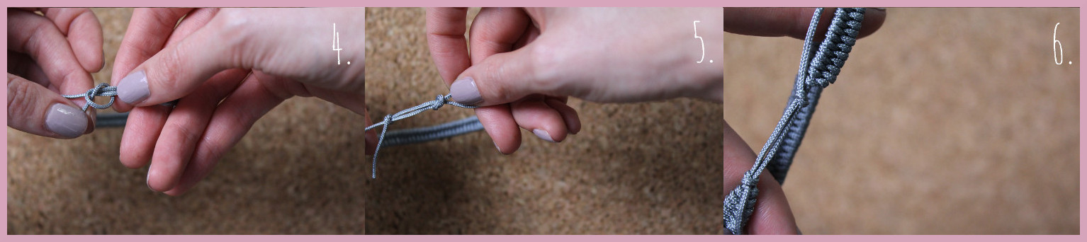- Man beginnt zunächst mit dem einen Ende der Schnur, das über die andere Schnur gelegt wird.
