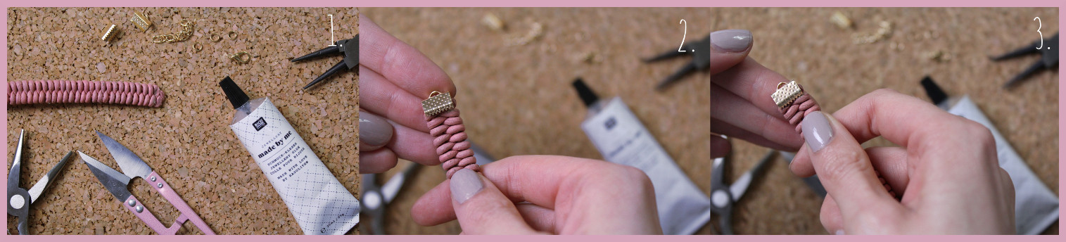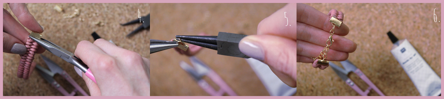 - Zunächst muss man die richtige Verschlussgröße für das Armband wählen und den Verschluss anschließend über das Ende des Armbandes legen. Tipp: Ich tupfe auf das Ende des Armbandes gerne etwas Schmuckkleber, damit das Ganze zusätzlichen Halt hat.