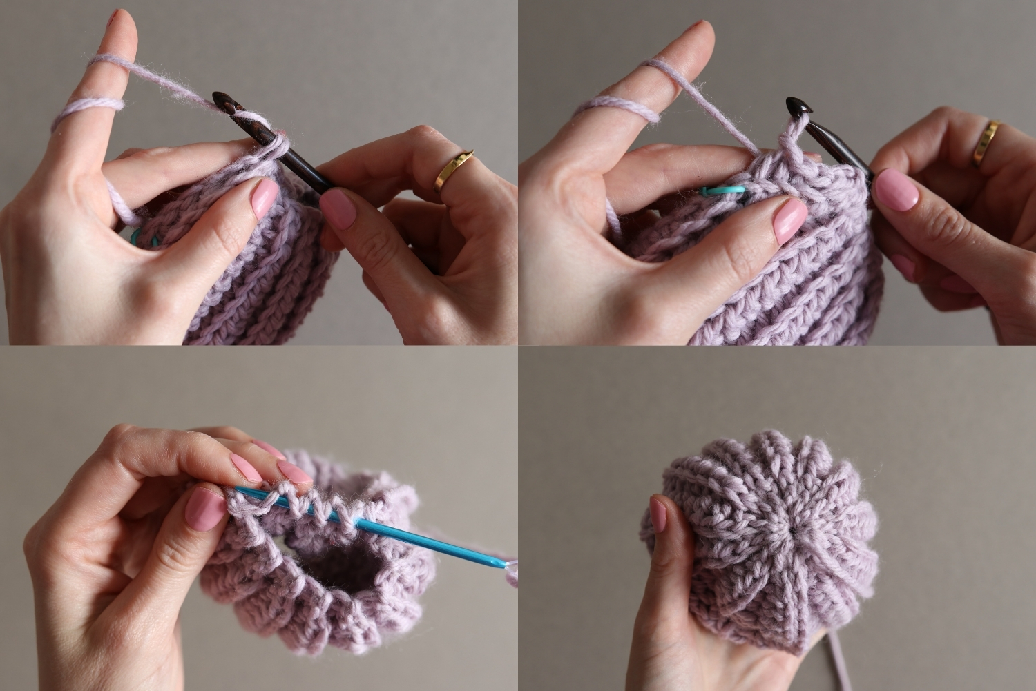 - Runde: jede 4. Masche verdoppeln (20 FM)