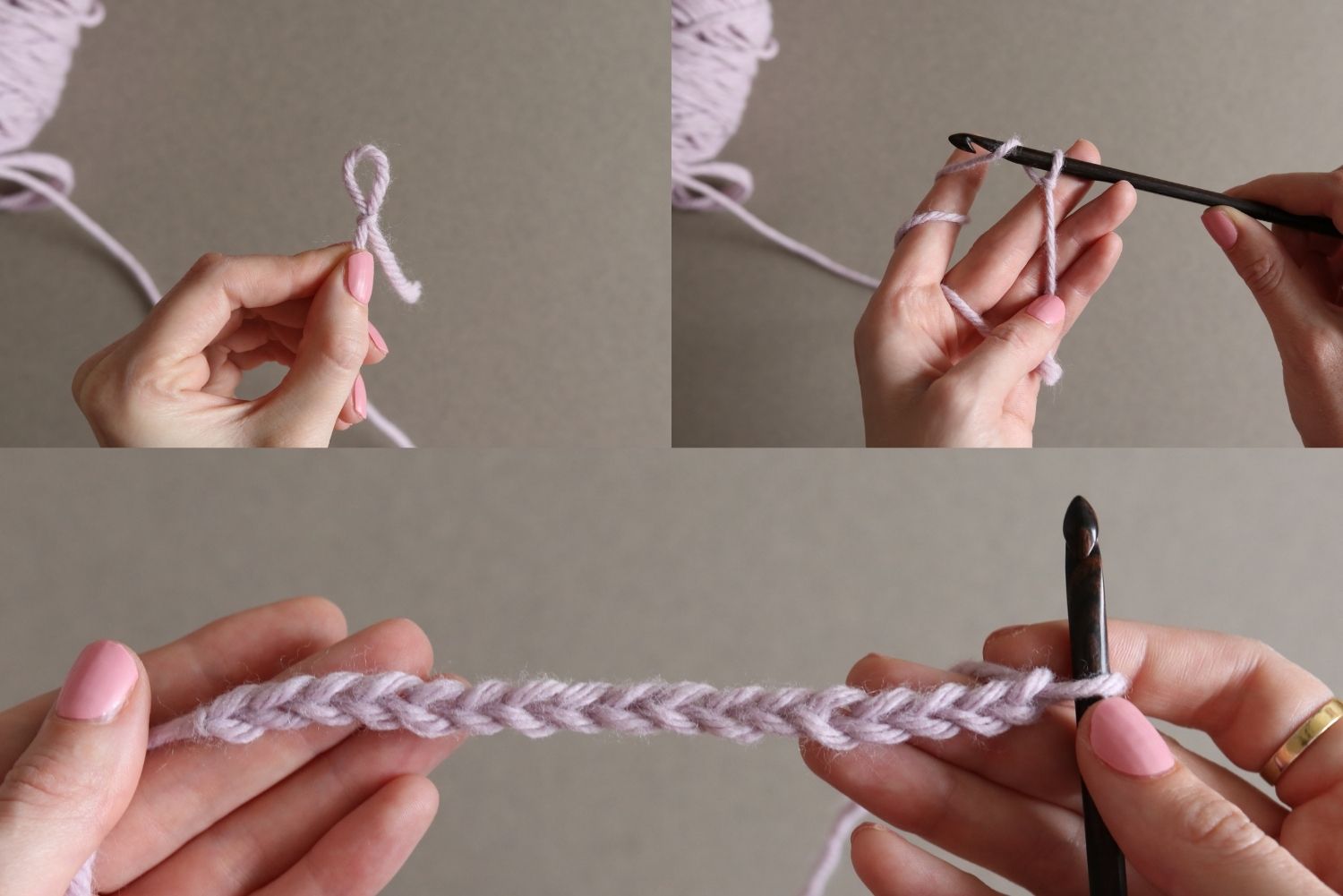 Tipp: Wenn du noch ein bisschen mehr Erklärung benötigst, schau gerne bei meinem Häkel-Grundkurs vorbei. Ich verlinke dir auch immer noch mal die Anleitung, wenn eine neue Maschenart das erste Mal benötigt wird. Klick auf die Bilder um ranzoomen zu können.