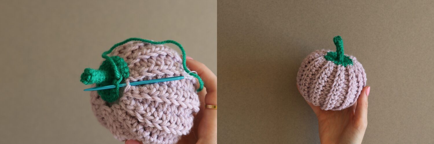 Zum Schließen des Kürbisses können mehrere Methoden genutzt werden. Du kannst ihn z. B. zusammennähen. Ich habe Kettmaschen genutzt.