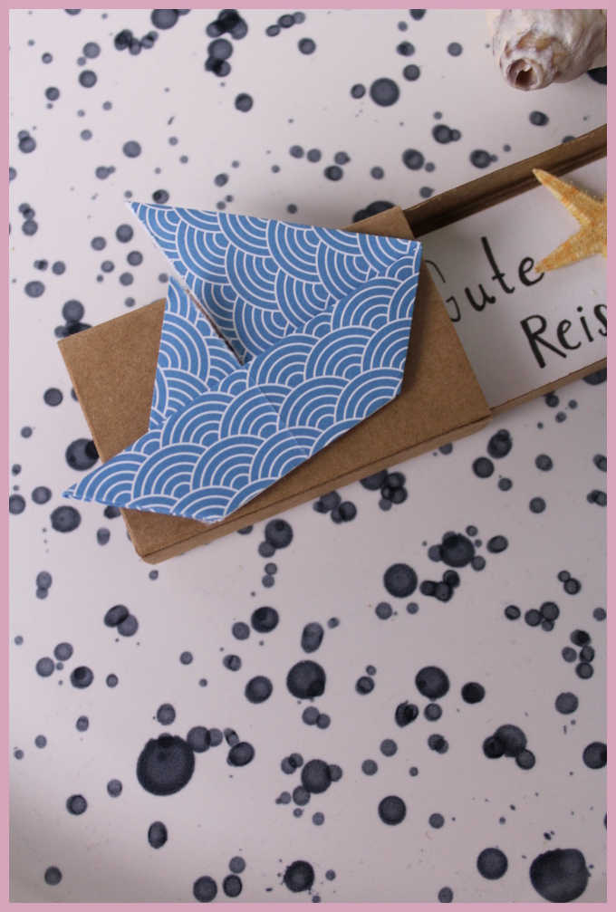 Wenn Du das Origami Segelschiff fertig gefaltet hast, kannst Du es ganz einfach auf die kleine Schachtel kleben. Damit wird es zur perfekten Verpackung für einen Urlaubsgutschein, auch Taschengeld für die Urlaubskasse ist hier gut aufgehoben. Mit einem kleinen Urlaubsgruß und einer Muschel oder einem Seestern rundest Du das ganze Geschenk ab. Das Format eignet sich außerdem auch wieder gut, um einen Geldschein zu falten.