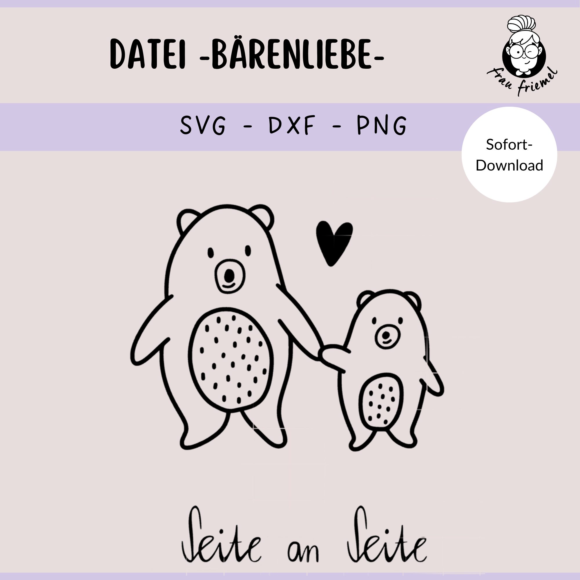 Nach dem Kauf erhältst du die Plotterdatei „Bärenliebe“ mit Herz und Schriftzug „Seite an Seite“ als digitalen Download in den Formaten SVG, DXF und PNG. So kannst du die Datei ganz einfach mit deinem Schneideplotter ausplotten.