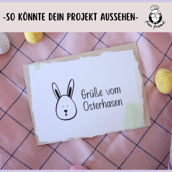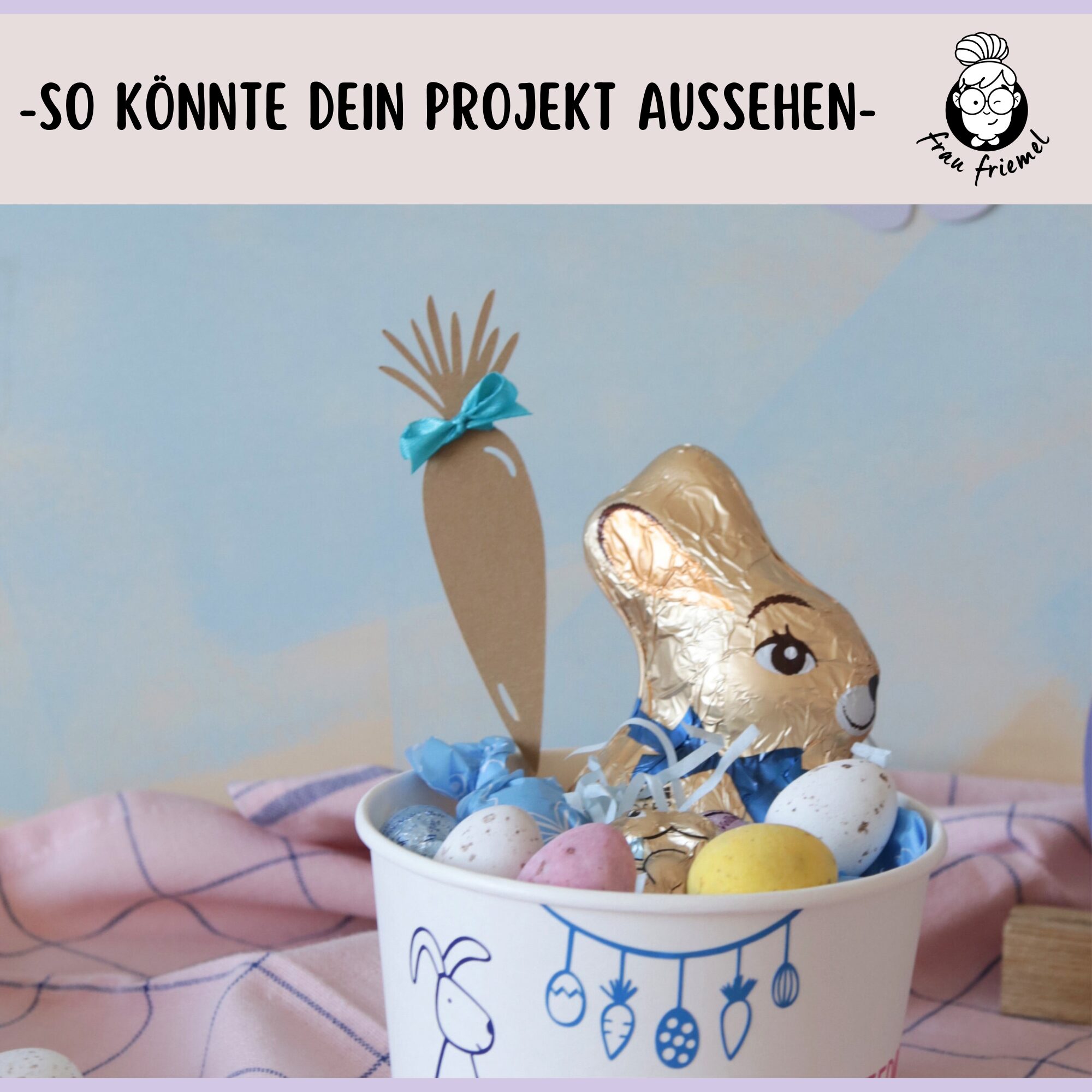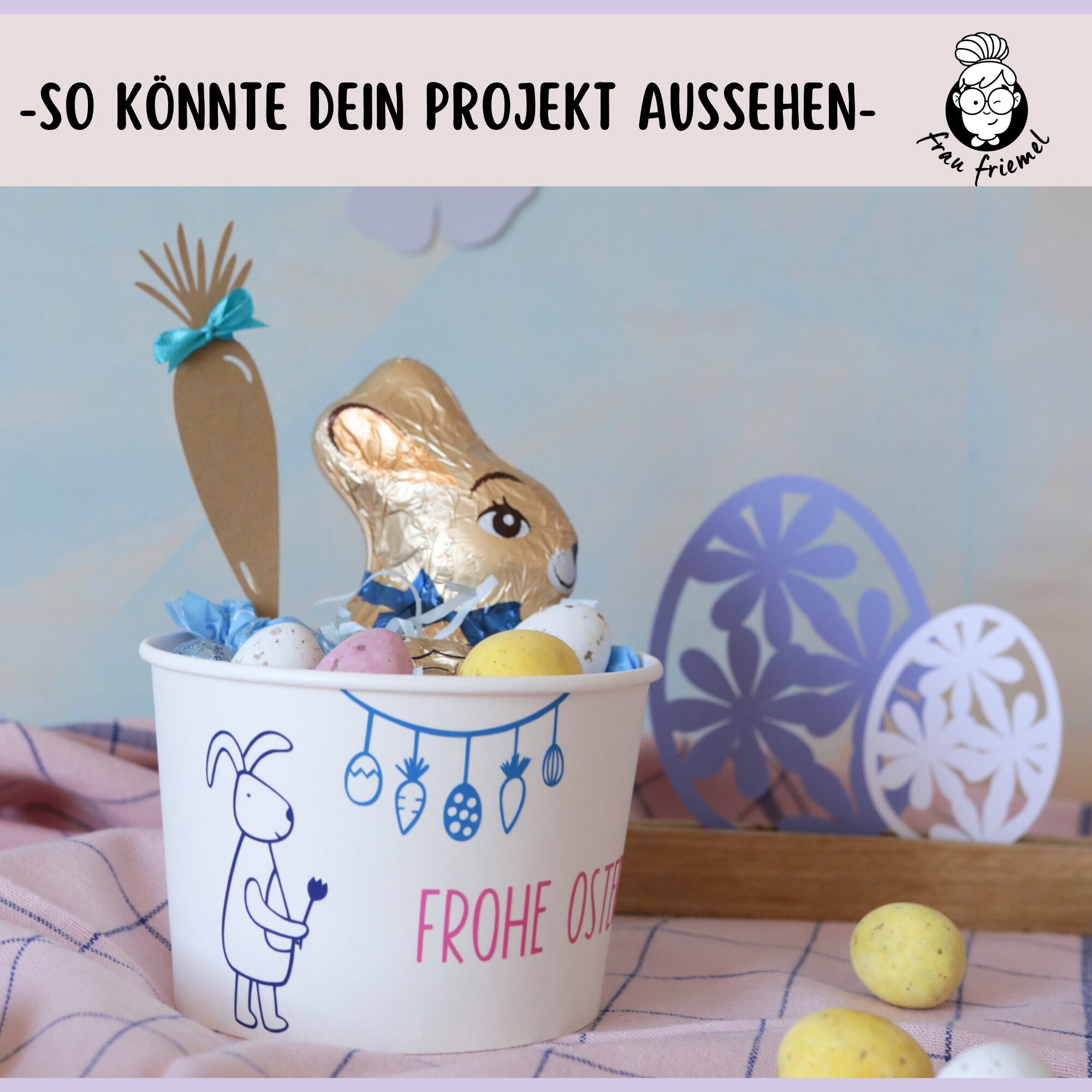 Gestalte zum Beispiel individuelle Osterkörbchen, indem du einen Osterhasen mit Schriftzug aus Vinylfolie ausplottest und mithilfe von Übertragungsfolie auf einen Pappbecher aufklebst. Auf diese Weise lassen sich auch tolle Osterkarten gestalten. Das Ostereier-Motiv kannst du aus Tonkarton ausplotten und die Eier an einen Osterstrauß hängen oder in einem Klötzchenhalter arrangieren. Die Möhre eignet sich ebenfalls perfekt, um lustige Anhänger oder Blumenstecker zu basteln, wenn du sie aus Papier ausschneidest.