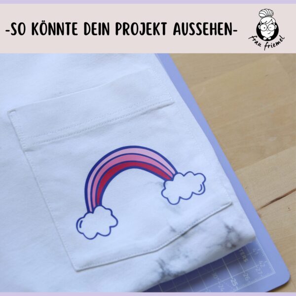 Die Regenbogen kannst du beispielsweise aus Flexfolie plotten und damit Textilien verzieren. Einige Motive eignen sich besonders gut für mehrfarbiges Plotten. Ich habe mir damit ein niedliches Regenbogen-T-Shirt gestaltet. Auch für Kinderkleidung sind die Designs wunderbar geeignet.