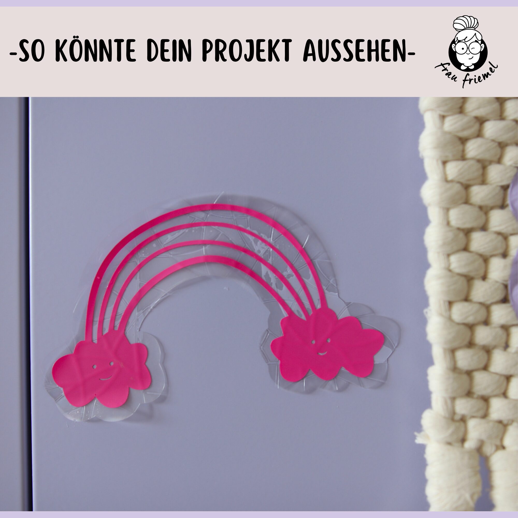 Alternativ kannst du die Regenbogen-Motive aus Vinylfolie schneiden, um daraus Suncatcher zu basteln. Dafür einfach eine Outline um das Motiv legen und diese aus Regenbogenfolie ausschneiden. Den geplotteten Regenbogen bringst du dann mithilfe von Transferfolie auf die Outline auf. So entsteht ein wunderschöner Sonnenfänger, der sich auch toll als Geschenk macht.