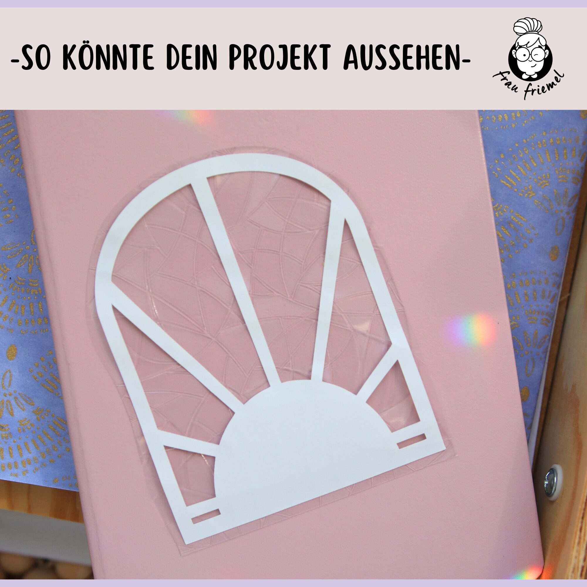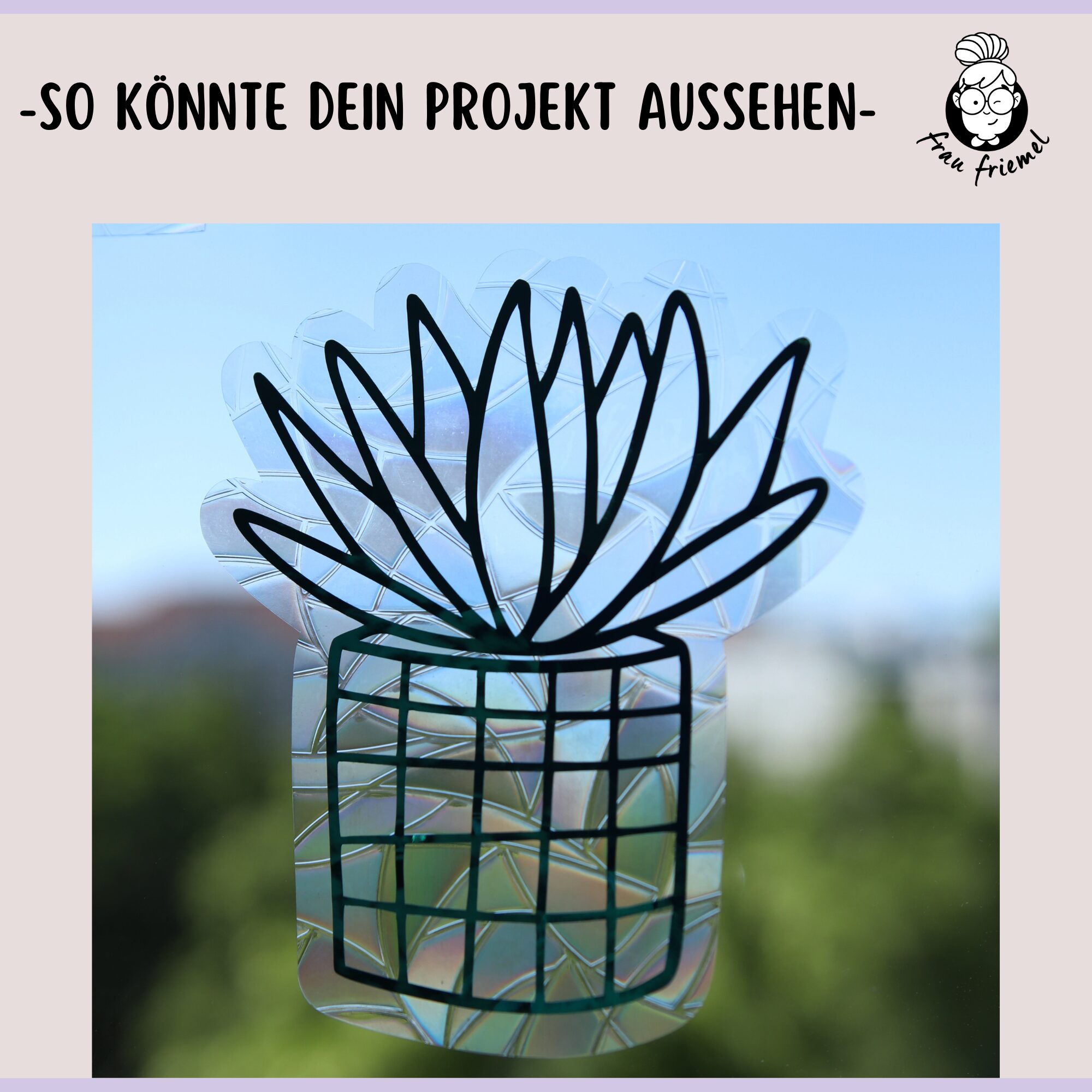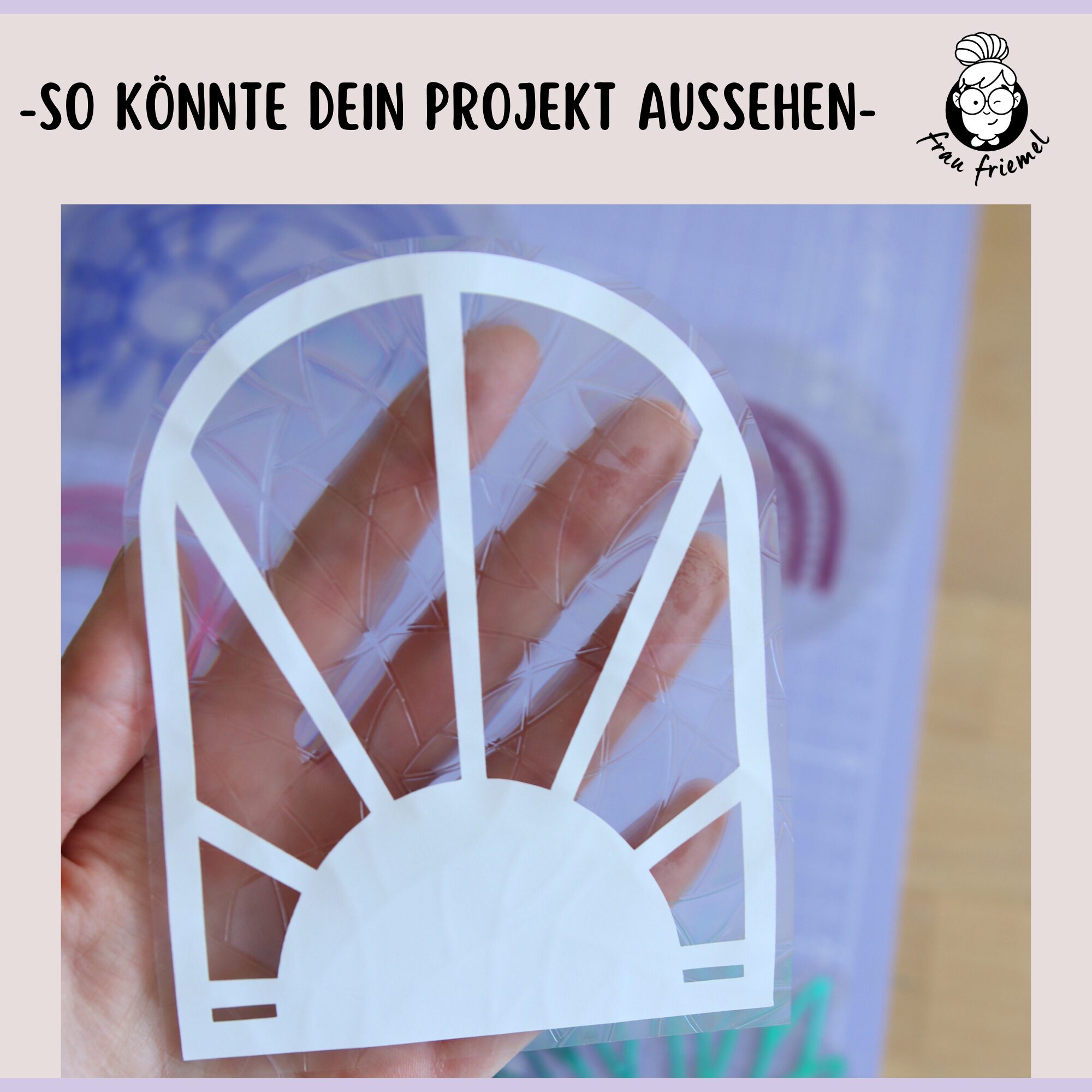 Die Motive wurden vorrangig für die Gestaltung von Sonnenfängern entworfen. Dafür habe ich zunächst eine Kontur um das gewünschte Motiv angelegt und diese aus Regenbogenfolie geschnitten. Die eigentliche Umrandung wurde aus Vinylfolie geplottet. Anschließend wird das Motiv mithilfe von Transferfolie auf die Regenbogenfolie übertragen. Danach kannst du deinen fertigen Suncatcher direkt am Fenster anbringen.