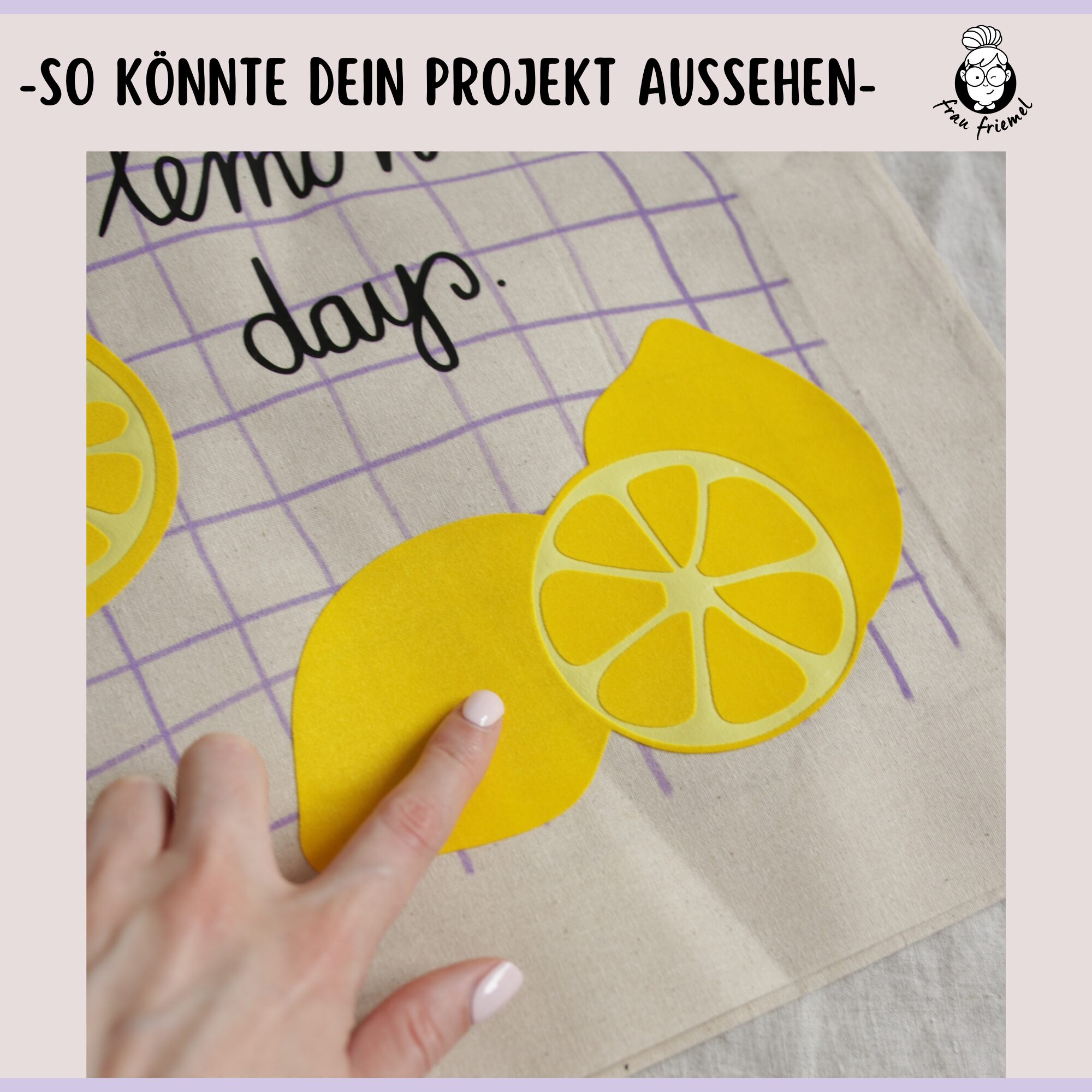 Ich habe die Plottervorlage genutzt, um einen sommerlichen Jutebeutel zu gestalten. Zunächst habe ich eine Hintergrundfläche für die Zitronen angelegt und diese aus gelber Flexfolie geplottet. Die eigentlichen Zitronenmotive wurden aus Flockfolie geschnitten und anschließend Schritt für Schritt auf den Beutel gepresst.