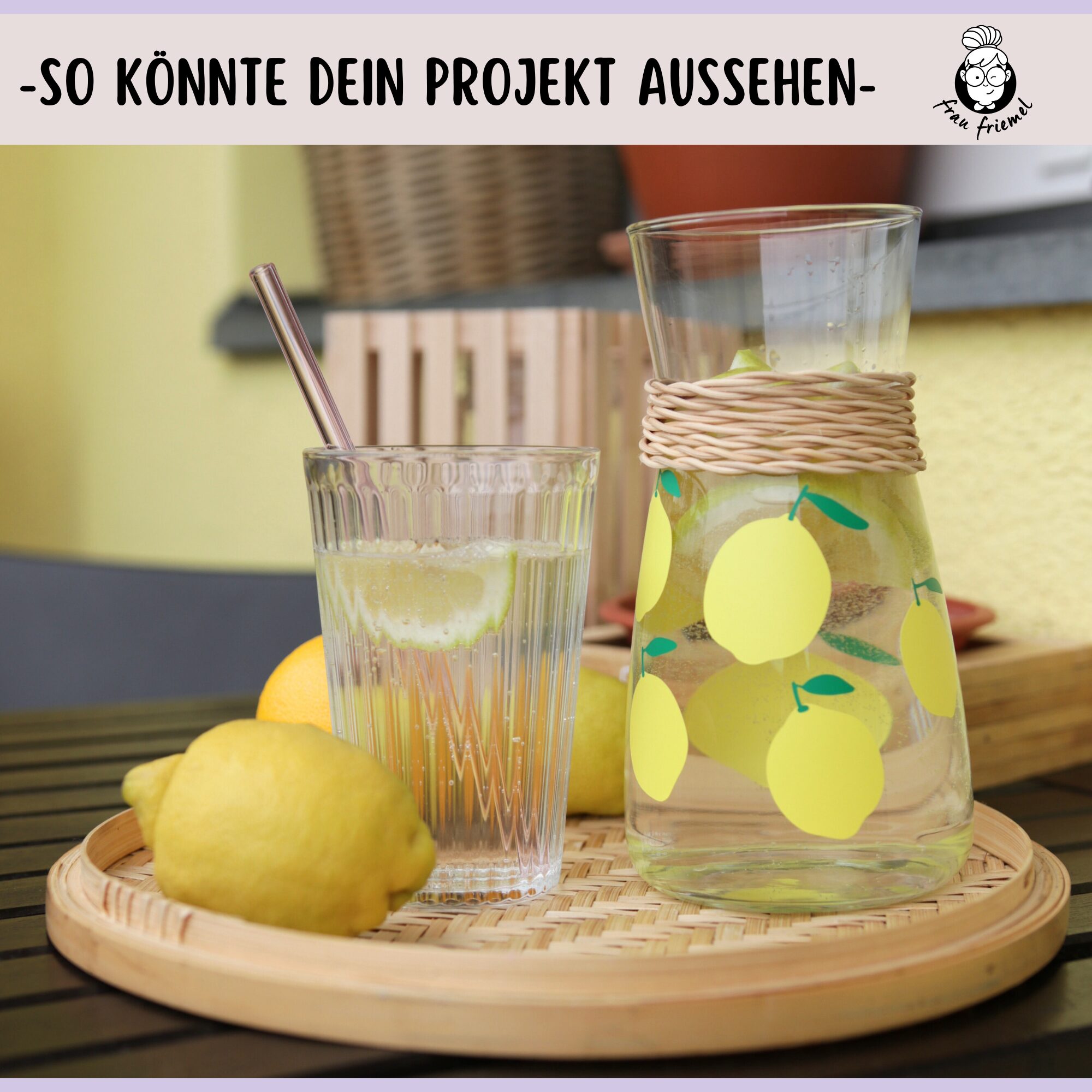 Ich habe mit der Zitronen-Plottervorlage eine Karaffe dekoriert. Dabei habe ich zunächst alle Stängel kopiert und jeweils von der passenden Zitrone subtrahiert, sodass eine Aussparung entsteht. Anschließend habe ich das Design aus Vinylfolie geplottet und direkt auf die Karaffe aufgeklebt. Eine Übertragungsfolie ist nicht nötig, wenn du die Motive ausreichend groß schneidest. Wichtig: Die Oberfläche der Karaffe sollte vor dem Aufkleben gründlich gereinigt werden.