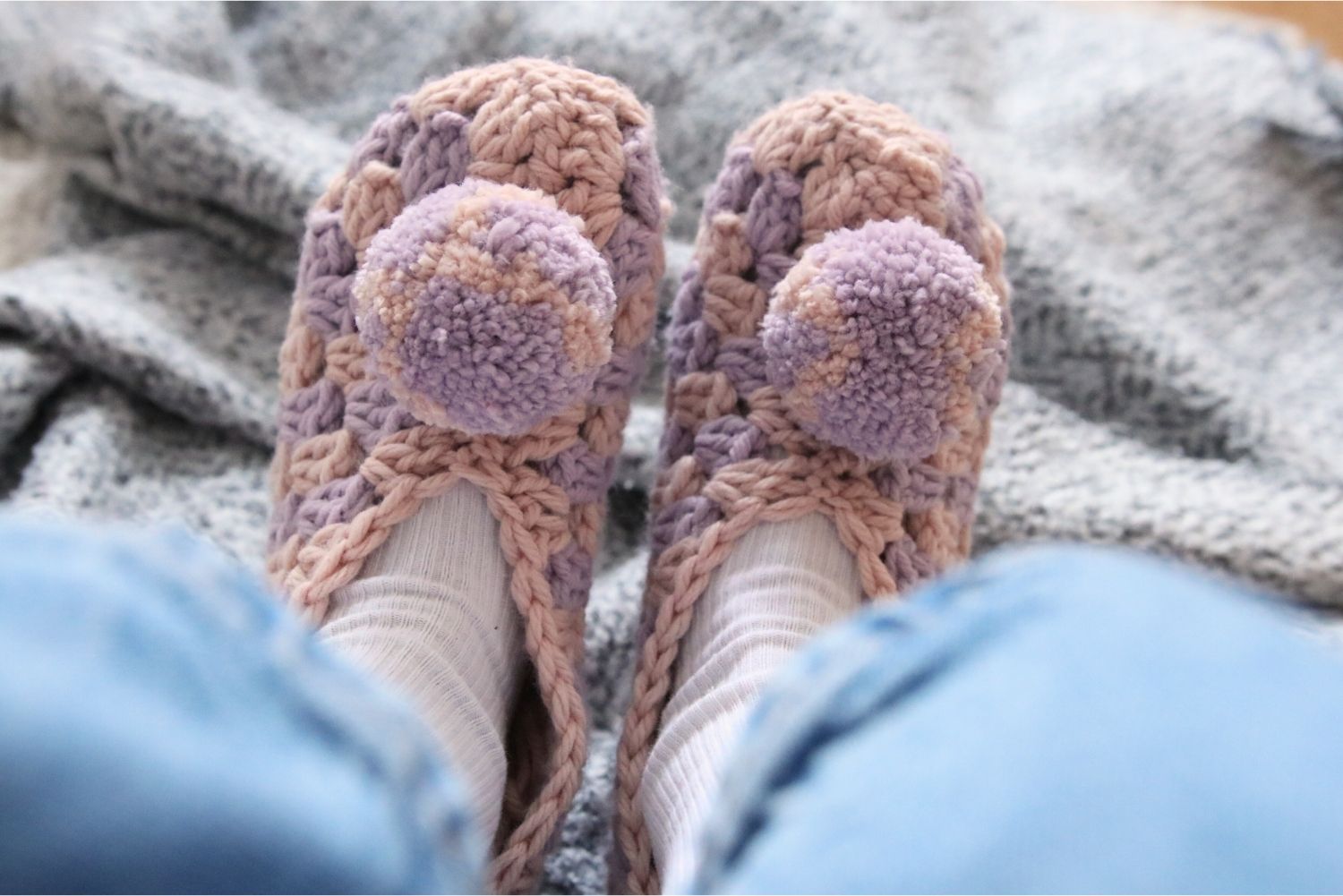 Du kannst die Pompons auch prima zum Aufhübschen von Häkelschuhen nutzen. Schau gerne mal bei meiner Häkelhausschuhe-Anleitung vorbei.