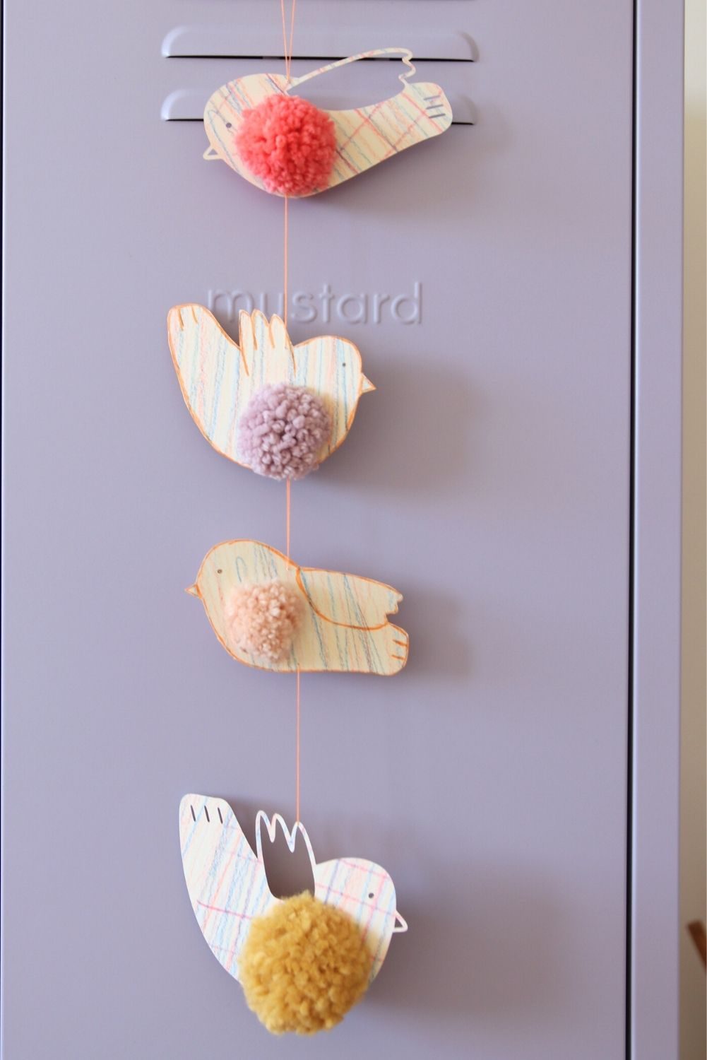 Du kannst hier ganz kreativ werden. Besonders eignen sich für Pompons Küken, Igel, Bären usw. – das macht bestimmt auch Kindern großen Spaß. Ich habe mich für ein paar frühlingshafte Vögel entschieden.