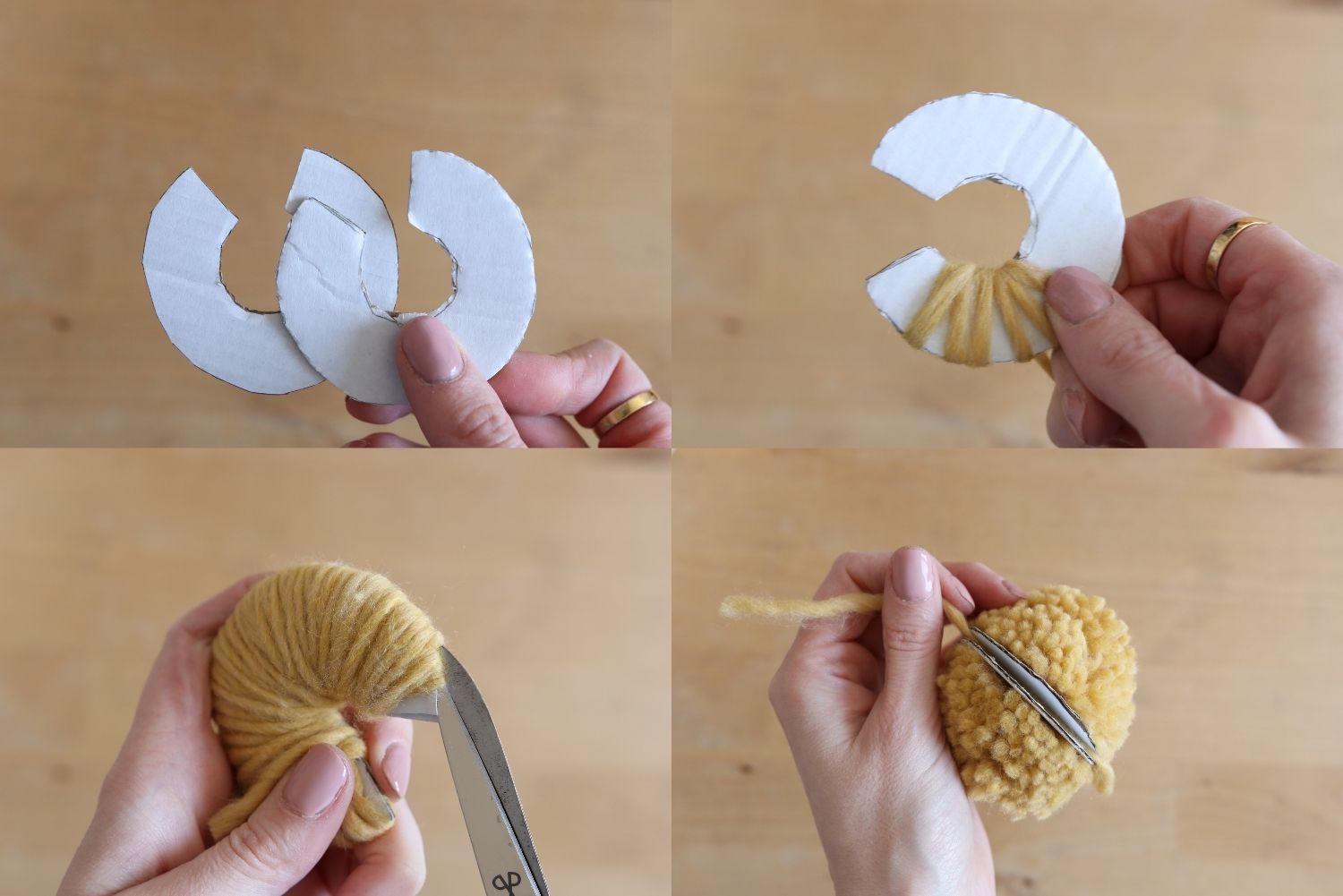 Das ist wahrscheinlich die Variante, die du auch schon aus Kindheitstagen kennst und hierfür kannst du einfach Pappe von alten Kartons nutzen. Wir haben früher einfach zwei Kreise aus Pappe ausgeschnitten mit einem Innenkreis versehen. Der Nachteil hier: du kannst kein ganzes Wollknäuel nutzen, da du ja durch die Mitte kommen musst. Cleverer ist es, wenn du einen Spalt an einer Seite offenlässt. So kannst du auch ein Knäuel nutzen.